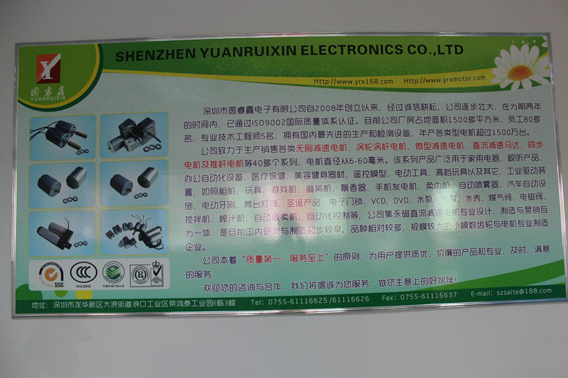 深圳市圓睿鑫電子有限公司自2008年創(chuàng)立以來,經(jīng)過誠信耕耘,在為期兩年的時間內(nèi),已通過ISO9001:2000國際質(zhì)量體系認證。公司廠房占地面積2000多平方米,員工100人,專業(yè)技術(shù)工程師6名,擁有國內(nèi)最先進的生產(chǎn)和檢測設備,年產(chǎn)各類減速電機超過2~300萬臺。因公司發(fā)展需要,于2020年底,將生產(chǎn)基地遷往擁有最美小鎮(zhèn)之稱的東莞市清溪鎮(zhèn),依山傍水,依托美麗的大自然環(huán)境和地方文化,全新的東莞市圓睿鑫電子有限公司將借助深圳母公司平臺,一步步走上新的臺階。 東莞公司將繼續(xù)致力于生產(chǎn)銷售各類無刷減速電機 渦輪渦桿電機,微型減速電機,直流減速馬達,交流手搖發(fā)電機、同步電機及空心杯電機等,電機直徑從6-60毫米為定位,系列產(chǎn)品廣泛用于智能家電、智能辦公自動化設備、智能醫(yī)療、美容健身器材、遙控模型、電動工具、高檔玩具以及其它工業(yè)驅(qū)動裝置,如高檔玩具、游戲機、麻將機、飄香器、手機發(fā)電機、柔巾機、自動噴霧器、汽車自動設施、電動牙刷、舞臺燈飾、圣誕產(chǎn)品、智能電子門鎖、VCD、DVD、水泵、氣泵、水表、煤氣閥、電磁閥、攪拌機、榨汁...